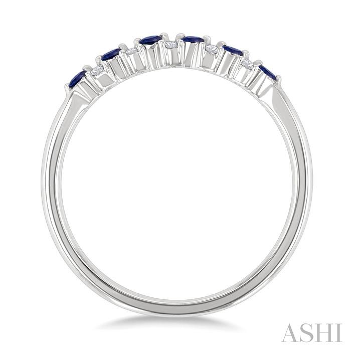 A beautiful precious gemstone band, this appeals to the eye instantly. It is stylish and elegant and a must-have addition to one’s jewelry box. The band features a lovely layout of sapphires and diamonds along the ring top. There are 6 round cut 1.9MM sapphires, with 2 each, total 10, prong set round cut diamonds lying vertically between the sapphires, embellishing the top. The precious gemstone sapphire and diamond band is crafted in a polished rhodium finish 14 karat white gold. Total diamond weight is 1/10 ctw.