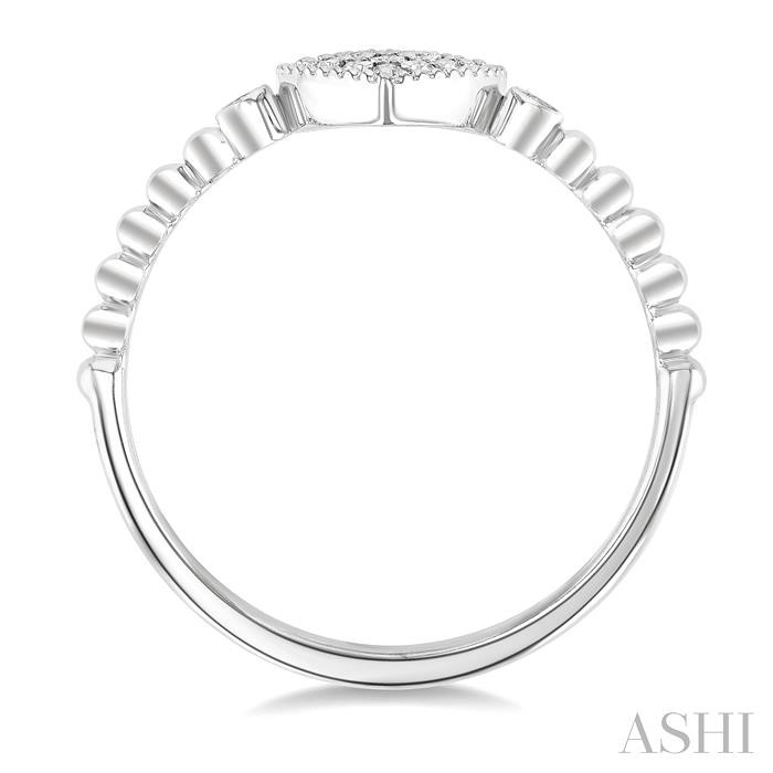 Heart-shaped jewelry has long been a symbol of love, making this diamond fashion ring an ideal gift for someone special or a meaningful addition to your own collection. Celebrate your most cherished moments with this exquisite piece from the Petite Collection, crafted to represent the depth of your emotions and the beauty of your bond. The enchanting ring features a heart-shaped centerpiece adorned with 17 prong set round cut diamonds, symbolizing love and affection. Flanking the heart mount is a small circular mount that showcases a bezel set round cut diamond each, adding a touch of sophistication and sparkle. A beaded shank enhances the ring’s delicate design. The diamond fashion ring is sculpted in a rhodium finish 10 karat white gold. Total diamond weight is 1/8 ctw.
