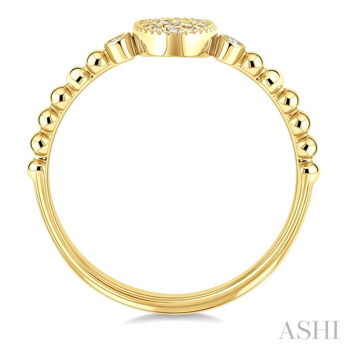 Perfect for any occasion, this diamond fashion ring from the season’s trending Petite Collection, is designed to captivate. The beautiful ring features an oval-shaped centerpiece adorned with 16 prong set round cut diamonds, radiating brilliance and sophistication. Flanking the oval mount is a small circular mount embellished with a prong set round cut diamond each, adding a touch of sparkle and balance. This is followed by a beaded shank that enhances the ring’s delicate design. The Petite diamond fashion ring is molded in 10 karat yellow gold. Total diamond weight is 1/8 ctw.