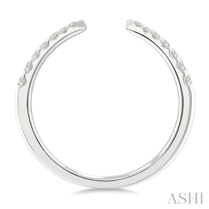 A striking blend of edgy design and refined elegance, this diamond open fashion ring adds a daring sparkle to any outfit. It features a pointed, claw-like open-ended center top, adorned with 7 fishtail-set round cut diamonds on either side, totaling 14 diamonds. The diamonds are arranged in a graduated manner, starting with the smallest at the pointed tip and increasing in size as they descend towards the shank. Styled in a rhodium finish 10 karat white gold, this diamond fashion open ring captures the essence of bold contemporary style. Total diamond weight is 1/5 ctw.
