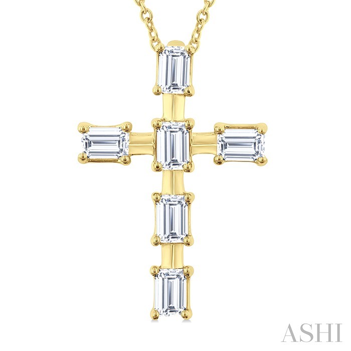 The Cross has spiritual symbolism, as it relates to the Christian faith, depicting God’s protection. This diamond pendant showcases a refined Cross design, featuring 4 spaced and vertically arranged fancy prong set emerald cut diamonds. Each diamond is meticulously positioned to enhance its brilliance and symmetry. Additionally, a fancy prong set emerald cut diamond flanks each side of the second diamond from the top, adding to the pendant’s eye-catching allure. Carried on a Chain25 link chain, both the Cross pendant and the chain are framed in 14 karat yellow gold. Total diamond weight is 1/2 ctw.