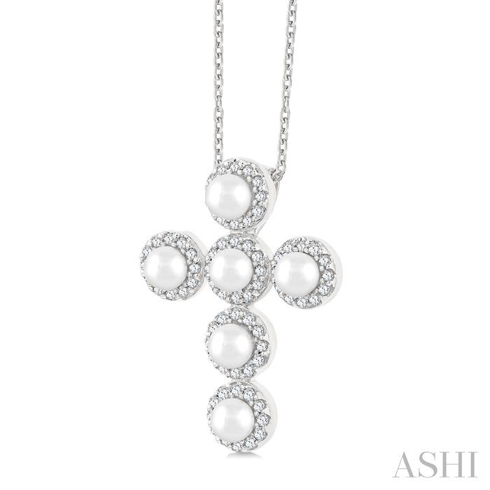 The Cross is a symbol relating to Christianity, and as per the religion, it signifies faith and the protection of God. It also symbolizes hope, good luck, fortune, and compassion. Besides its religious attraction, the cross is also worn as a fashion accessory by both Christians, as well as those from other religions. This Cultured Pearl and diamond cross fashion pendant, makes for a sophisticated choice. It features 4 vertically lined 4X4 MM round Cultured Pearls, with a Cultured Pearl each, total 2, horizontally flanking the second Cultured Pearl in the vertical row. Each of these Cultured Pearls is haloed by diamonds, a total of 84 prong set round cut diamonds, 14 on each halo. A CAT23 chain carries the fashion pendant, both of which are styled in a rhodium finish 14 karat white gold. The total diamond weight is 1/4 ctw.