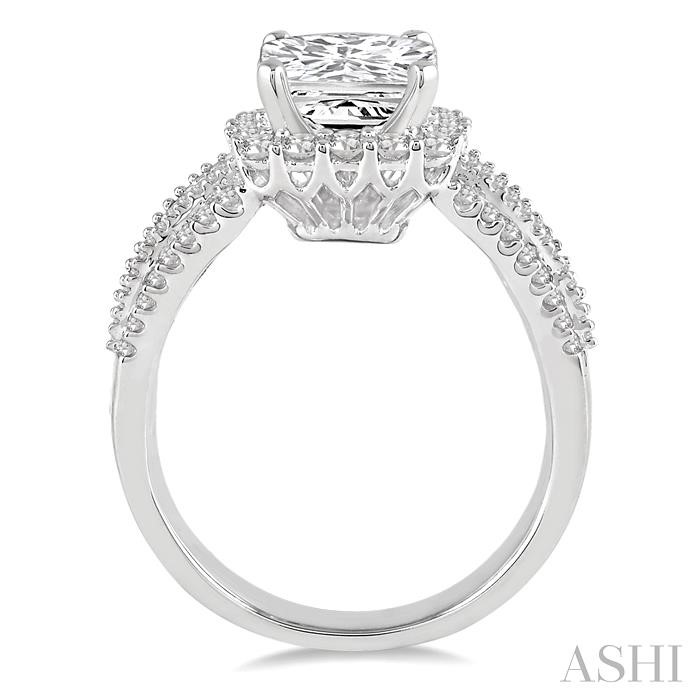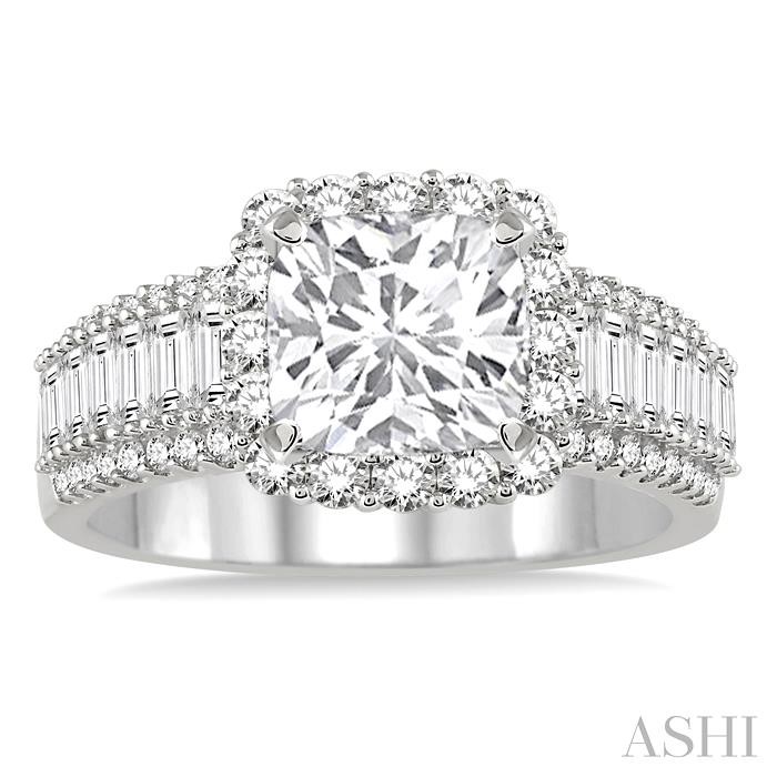 Let this beautiful diamond semi-mount ring be a marvelous gift of love for her. Fashioned in 14 karat lustrous white gold, this majestic ring is embellished with 62 glittering baguette and round cut diamonds framing a square on the head and lined the broad shank in brilliant rows. Diamonds are elegantly set in prong and pave settings. This ring is designed to complement your choice of center stone ranging from 1.00 carat to 1.50 carat. Total diamond weight is 1 1/5 ctw.