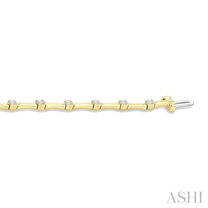 Bamboo is a symbol of resilience, strength, and flexibility in many cultures, representing the ability to bend without breaking and thrive in challenging conditions. This fashion bracelet’s fusion of natural inspiration and sophisticated diamond accents makes it a perfect piece for any occasion. It features a sequence of bamboo-shaped internodes, each meticulously connected by a round cut diamond nestled between them, symbolizing the linking nodes of a bamboo stalk. A total of 19 prong set round cut diamonds add radiant brilliance to this unique design. Molded in 14 karat yellow gold, the bracelet secures with a push-release open box clasp closure. The total diamond weight is 1 ctw.
