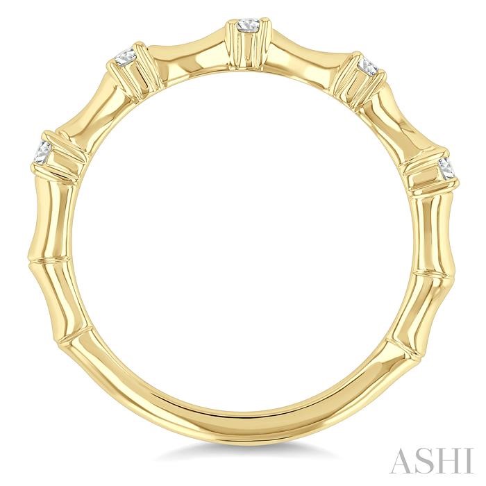 Combining nature-inspired elegance and symbolic significance, this diamond fashion ring makes for a meaningful accessory. Bamboo symbolizes resilience, strength, and flexibility in many cultures. It signifies growth, renewal, and the potential for prosperity, making the ring a thoughtful choice for someone who values these qualities. The top of the ring is designed to resemble a bamboo shoot, set in plain gold along with the shank. Creating a contrasting balance are the shimmering prong set round cut diamonds, total 5, embellishing each of the nodes on the bamboo shoot. The diamond fashion ring is carved in 14 karat yellow gold, complementing the sparkle of the diamonds and enhancing the overall aesthetic. Total diamond weight is 1/5 ctw.
