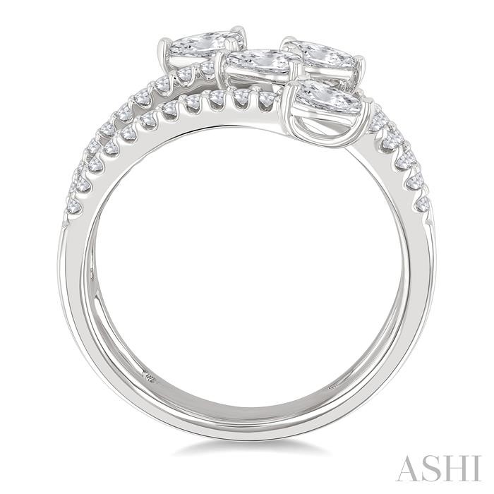 Enhance your look with this striking diamond fashion ring, perfect for those who appreciate creativity and elegance in their accessories. The ring features a wide split shank, elegantly forming two bypass arms on either side. Each arm is embellished with a prong set pear cut diamond at its tip, total 4 on all arms. Following the pear cut diamond on the 4 bypass arms is a total of 40 prong set round cut diamonds, adding to the ring’s brilliance. The diamond open fashion ring is crafted in a polished rhodium finish 14 karat white gold. Total diamond weight is 7/8 ctw.