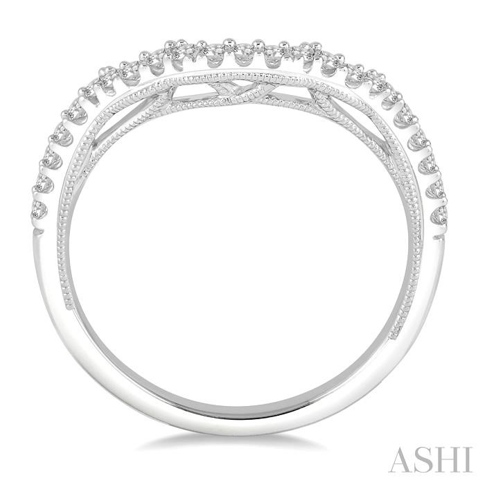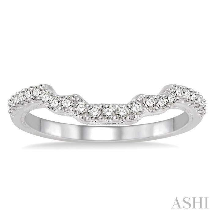 This fascinating Diamond Wedding Band is the perfect complement to the joyous occasion. Set delicately with 23 sparkling round cut diamonds, the ring casts its magic with prong styled setting. The luminescence of the ring is unparalleled. This ring is made in 14 karat white gold with milgrain finish. Total diamond weight is 1/4 Ctw.