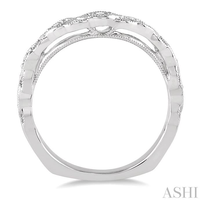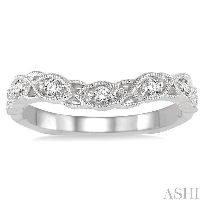 Intricate lattice leaf motifs are the highlights of this attractive wedding band. To add to the elegance is an amazing milgrain finish that clearly defines the caved motifs, lending the ring a pretty look. 7 pave set round cut diamonds adorn each of the leaf motifs, giving more visual appeal to the dashing wedding band. The ring is styled in a polished finish 14 karat white gold. Total diamond weight is 1/6 ctw.