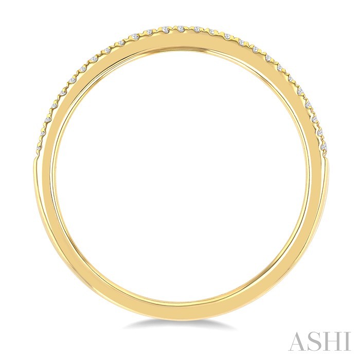 A versatile diamond fashion ring, this offers a sleek and modern design that adds a touch of elegance to any outfit. It features a double row of round cut diamonds, running parallel along the ring top, creating a striking visual impact. A total of 54 round cut diamonds embellish the ring, 45 using a fishtail setting, and 8 utilizing a prong set technique. The diamond fashion ring is molded in 14 karat yellow gold, providing a reflective surface, enhancing the overall brightness of the diamonds. Total diamond weight is 1/5 ctw.