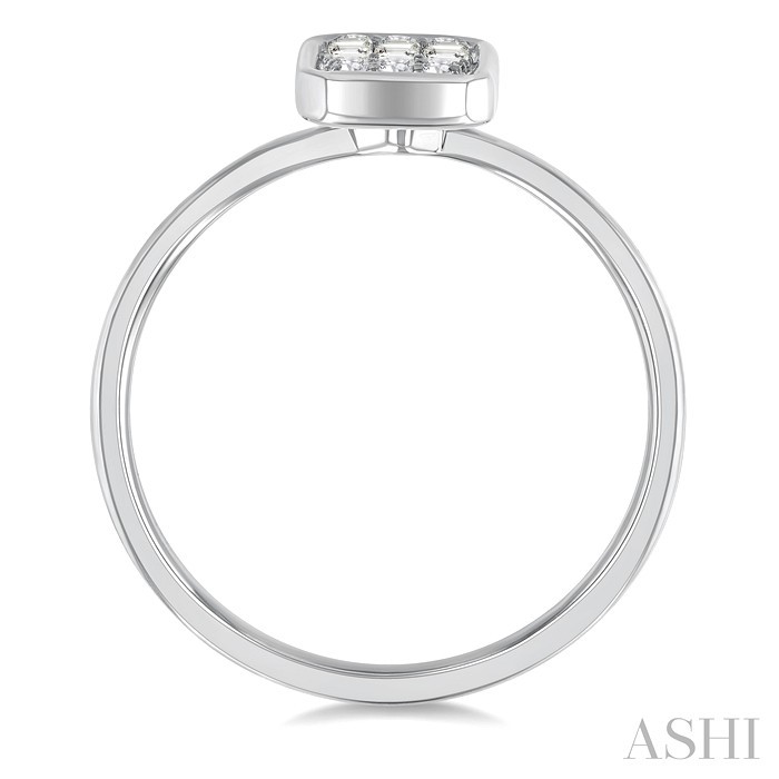 A stunning combination of classic elegance and modern flair, this Petite fusion diamond fashion ring, sparks instant admiration. Coming from the trending Petite Collection adds to the charm. It features a bezel emerald-shaped center mount, embellished with a fusion of baguette and round cut diamonds. While 3 prong set baguette cut diamonds grace the center of the mount in a vertical layout, 3 each prong set round cut diamonds nestle above and below the baguette arrangement, precisely filling the emerald-shaped mount. A plain gold shank lays focus on the diamonds. The Petite fusion diamond fashion ring is crafted in a rhodium finish 10 karat white gold. Total diamond weight is 1/6 ctw.