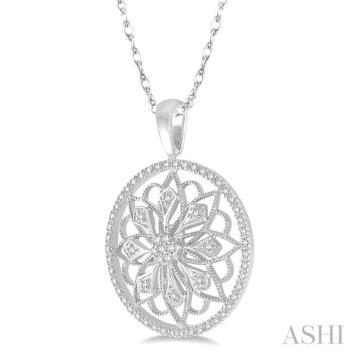 Add charisma to your neckline with this stunner diamond circle flower pendant. Crafted in glinting 10 karat white gold this milgrain finish floral designed pendant is graced with a cluster of 7 prong set round cut diamonds nestled amid open work petal design and embellished by 55 prong and pave set round cut diamonds accents in circle design. This pendant hangs from a Rope chain. Total diamond weight is 1/5 ctw.