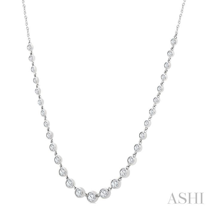 This classy diamond tennis necklace is designed to make a statement, effortlessly enhancing any attire with its sophisticated sparkle. The necklace showcases a stunning halfway adorned layout of graduated bezel set round cut diamond links. At its heart, a 1/8 ctw bezel set round cut diamond commands attention, beautifully flanked by 8 graduated bezel set round cut diamonds on each side. This graceful gradient is seamlessly followed by a row of 7 each same-sized bezel set round cut diamonds, creating a harmonious and dazzling effect along the neckline. Completed with a Catchain30 Spool, the diamond tennis necklace is styled in a rhodium finish 14 karat white gold. Total diamond weight is 1 1/4 ctw.