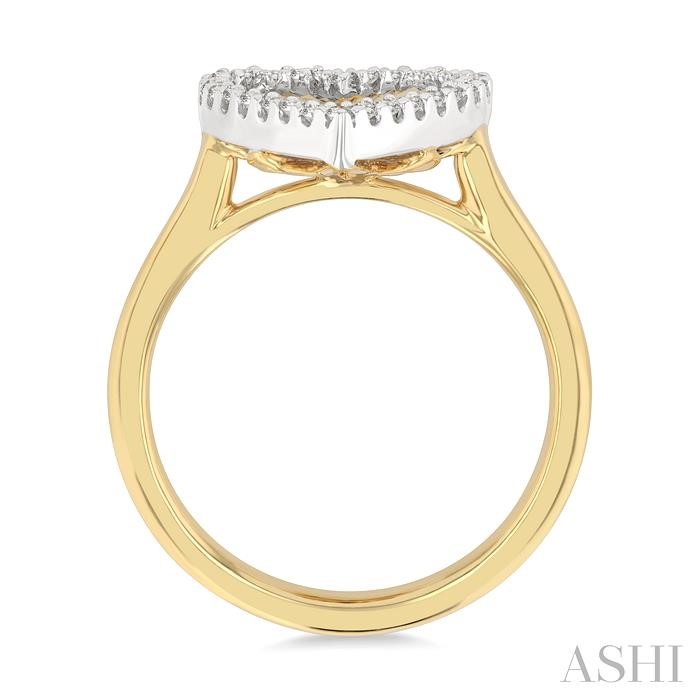 The heart represents love in all forms, be it romantic, familial, affection for a friend or even self-love. Whether for expressing deep emotions or simply adding a romantic touch to any outfit, this diamond fashion band makes for a stylish pick. It features a fluted heart-shaped centerpiece, symbolizing love, affection, and devotion. The textured heart is beautifully highlighted by a shimmering border of 28 prong set round cut diamonds, adding a touch of sparkle and sophistication. Crafted in 10 karat yellow and white gold, this diamond fashion ring combines timeless symbolism with contemporary style. The total diamond weight is 1/6 ctw.