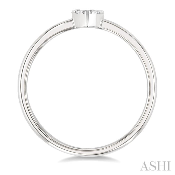 Ideal for any occasion, this Lovebright diamond fashion ring is a cherished addition to any jewelry collection. It features a striking heart-shaped center mount, embellished with a dazzling cluster of 7 invisible set round cut diamonds, 1 in the center and 6 surrounding it, creating a captivating sparkle. A plain gold reverse tapered shank elegantly emphasizes the heart shape center mount, highlighting its intricate design. The Lovebright diamond fashion ring is carved in a rhodium finish 10 karat white gold. Total diamond weight is 1/10 ctw.