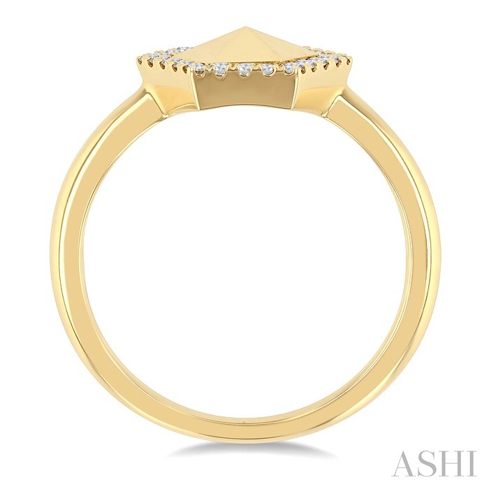 A modern look geometric diamond fashion ring, this appeals to the senses instantly. It comes from the adorable Petite Collection, an assemblage that has been a huge favorite this season. The ring features a hexagonal shape center mount, with a hexagon shape plain gold center and a diamond halo surrounding it. There are 24 prong set single cut diamonds embellishing the halo. A plain gold shank completes the ring. The hexagonal diamond fashion ring is carved in 14 karat yellow gold. Total diamond weight is 1/6 ctw.