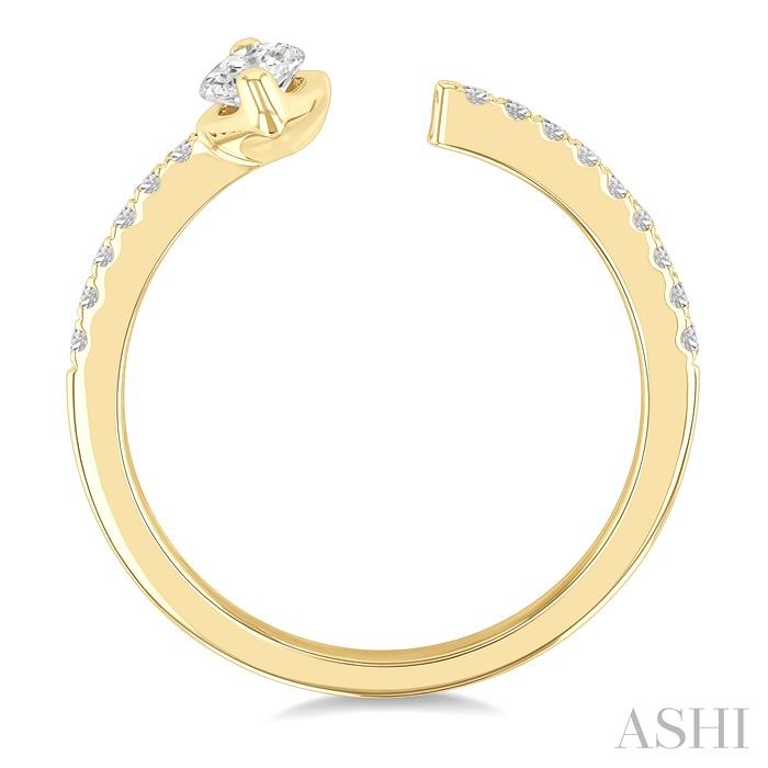 This striking diamond fashion open ring offers a fine blend of elegance and style, making it a cherished addition to your jewelry collection. It features an open center design with luminous diamonds decorating its either ends. At one end of the open center sits a dazzling fancy half bezel set 1/4 ctw marquise cut diamond center stone, radiating brilliance and allure. This is followed by 6 micro wall set round cut diamonds on the shank, adding a touch of sparkle to the center stone. On the other open end, along the shank, are 9 micro wall set round cut diamonds enhancing the ring’s beauty. The diamond open fashion ring is molded in a polished finish 14 karat yellow gold. Total diamond weight is 3/8 ctw.