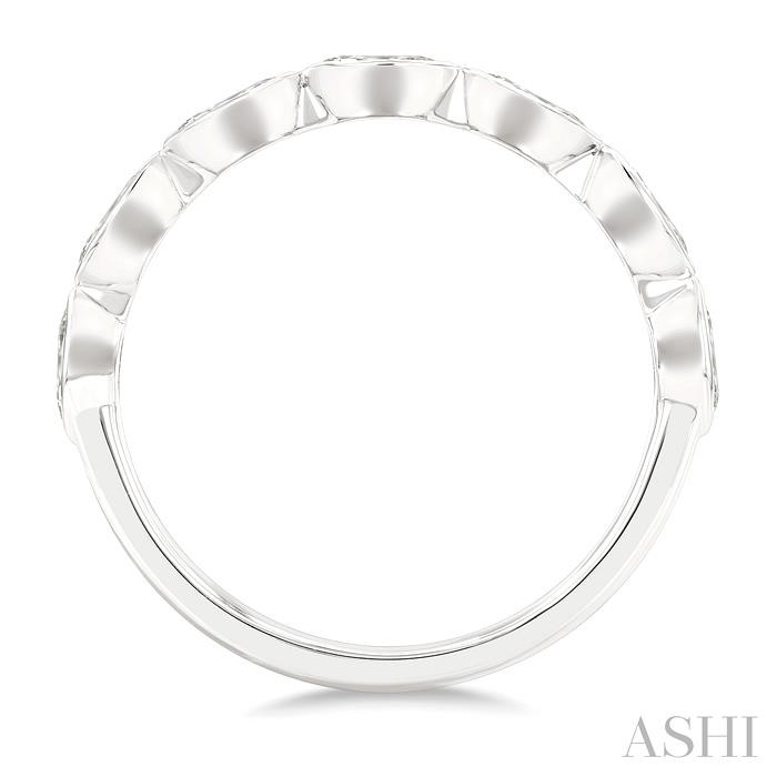 An attractive stackable diamond fashion band, this makes a fine addition to one’s collection. It can be mixed and matched with different stack bands for a new look every time. The stackable band features a straight row of seven marquise mounts, inlaid with east-west set marquise cut diamonds. There are 7 bezel set 1/10 ctw marquise cut diamonds embellishing the marquise mounts. The stackable bezel diamond fashion band is sculpted in a rhodium finish 14 karat white gold. Total diamond weight is 3/4 ctw.
