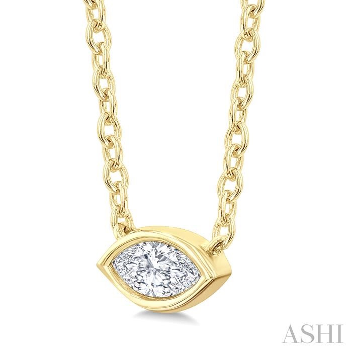 An expression of refined beauty and grace, this Petite diamond fashion pendant, from the trending Petite Collection, adds a touch of luxury to any attire. It features an east-west set marquise-shaped mount, adorned with a dazzling bezel set marquise cut diamond, radiating elegance and charm. a CAT23 chain comes included to carry the pendant, both of which are designed in 10 karat yellow gold. Total diamond weight is 1/6 ctw.