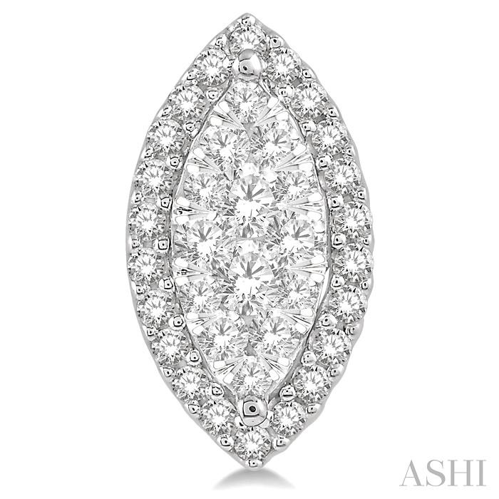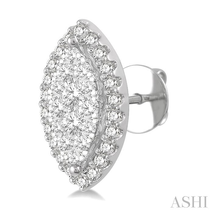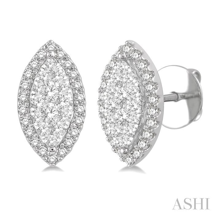 A grand pair of Lovebright diamond stud earrings, these offer opulence and sophistication to your look. The marquise shape studs feature a raised marquise mount in the center, and are magnificently embellished with round cut diamonds. Each center mount is adorned by 2 large invisible set round cut diamonds, with 12 small invisible set round cut diamonds surrounding them. 22 pave set round cut diamonds, a total of 44 on both earrings, border the raised marquise mount. The earrings are styled in 14 karat white gold. Total diamond weight is 1/2 Ctw.