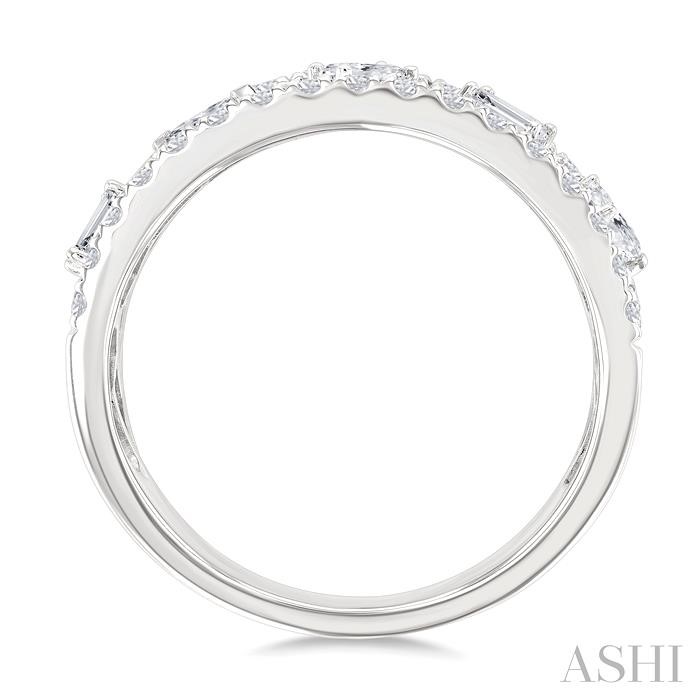 A captivating layout of different diamond cuts, lends sophistication and style to this gorgeous 5-stone diamond fashion band. Its flawless craftsmanship, and eye-catching design, reflect your impeccable taste and unique sense of style. The band features a prong set marquise cut diamond, and 2 each, prong set oval cut and emerald cut diamonds, embellished at a certain distance from each other, at focal points on the ring top. Running parallel on either side , along the borders, is 17 each, total 34, prong set round cut diamonds. The diamond fashion band is crafted in a polished rhodium finish 14 karat white gold. Total diamond weight is 7/8 ctw.