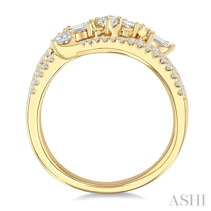 Indulge in the ultimate expression of timeless elegance, with this stunning diamond fashion ring. It features a split shank, where on one side, the split arms widen in the middle and then meet at the center top, while on the other side, the split arms curve and extend out at the center top. Intersecting the split shank at the top, is a row of mixed diamond cuts that take center stage. Placed in a slight arch, the row includes a prong set pear cut diamond, followed by a baguette, an oval, a princess cut diamond, and finished with another prong set baguette cut diamond, each exuding its own unique charm and allure. Further, the split shank is embellished with a total of 48 prong set round cut diamonds. The warm tone of a polished finish 14 karat yellow gold provides the perfect backdrop for the dazzling fashion ring. Total diamond weight is 3/4 ctw.