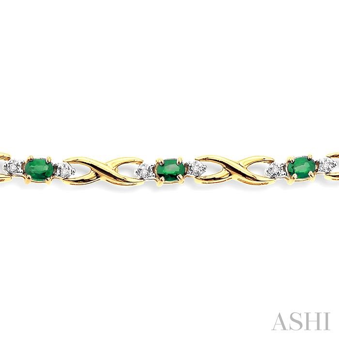 shower your love on her with this radiant Emerald and Diamond Bracelet. This graceful bracelet is crafted in lustrous 10 karat yellow gold featuring 10 fascinating prong set Emerald accented with 20 single cut diamonds in prong setting. This amazing Bracelet fastens with a secure clasp. Total diamond weight is 1/10 Ctw and each oval cut Emerald measures 4×3 MM.