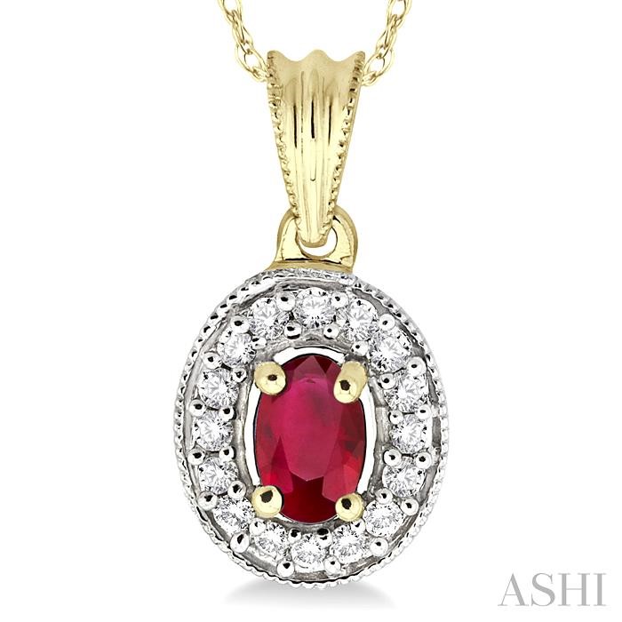 Give this scintillating oval cut Ruby and diamond pendant to your loved one for a dazzling style. A deep blue oval cut Ruby staged centrally in this charming pendant is encircled by 16 sparkling prong set round diamonds. A warm gift of love for her, this promising pendant is styled in 14 karat gleaming yellow gold with milgrain finish. This lovely pendant dangles from a shining Rope chain. Total diamond weight is 1/5 ctw and the oval cut Ruby measures 6×4 MM.
