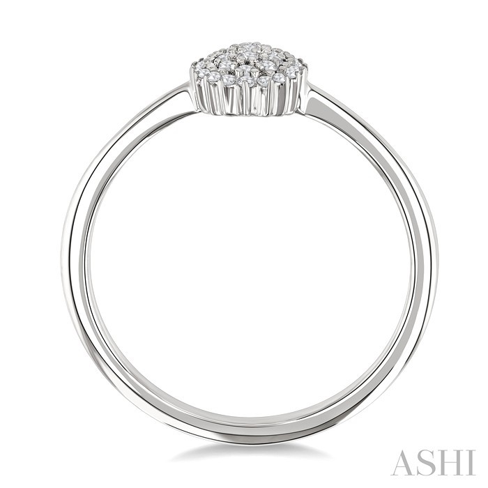 A perfect accessory for any occasion, this diamond cluster fashion ring from the trending Petite Collection, can be worn as a standalone piece or stacked with other rings to add a showy look and spark admiration. It features an oval-shaped center mount, resting on a plain gold shank. A cluster of 31 prong set round cut diamonds embellish the center mount, enhancing the beauty of the oval shape and adding a touch of glamour to the piece. Boasting a timeless shine, the plain gold shank allows the diamond cluster to take center stage. The Petite diamond cluster fashion ring is framed in a rhodium finish 10 karat white gold. Total diamond weight is 1/6 ctw.