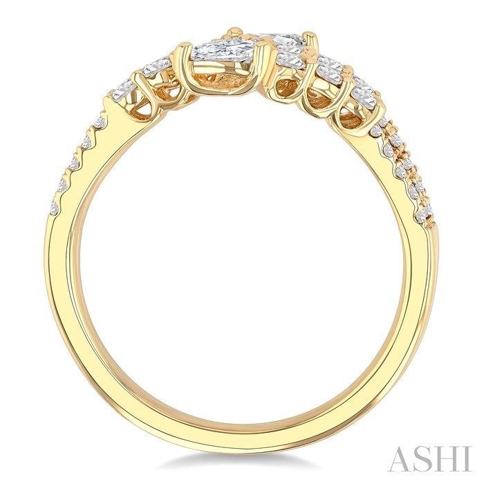 Chic and appealing, this diamond fashion band makes a fine addition to one’s jewelry collection. It features a split shank creating a dynamic triple-arm look, with a central row crossing over to the opposite side, and the open-ended outer arms displaying a bypass design showcasing a 1/6 ctw pear cut diamond at the tips. While the center row is adorned with 7 prong set round cut diamonds in the middle, flanked by 5 smaller round cut diamonds on each side, the bypass arms are accented with 3 large and 5 small prong set round cut diamonds each. Styled in 14 karat yellow gold, the fashion band reflects sophistication and modern style. Total diamond weight is 1 ctw.