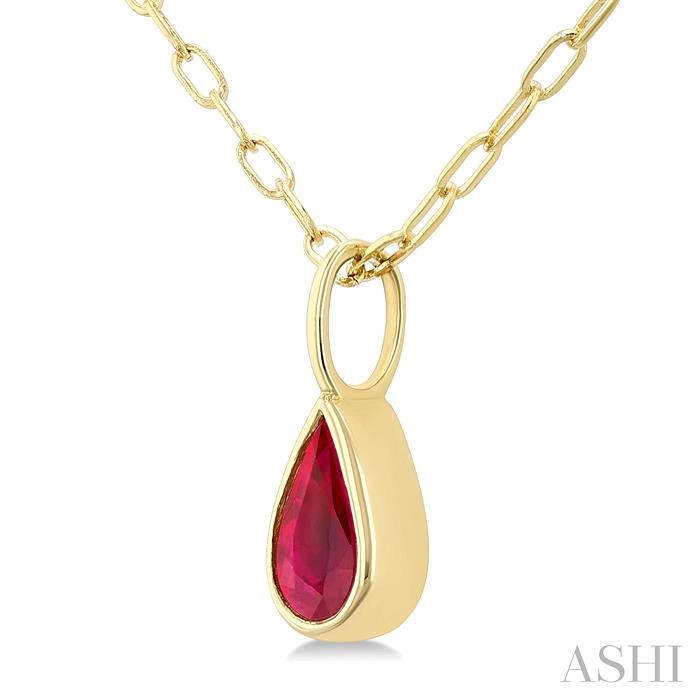 This precious pendant makes an ideal gift for a loved one or a meaningful addition to your personal collection. Its bold yet refined design ensures it will remain a cherished piece for years to come. The pendant features a pear-shaped mount that cradles a 6X4MM pear cut ruby, celebrated for its deep red hue and symbolism of passion, love, and vitality. A bezel setting projects the gemstone’s vibrant intensity. Suspended from an 18-inch 1.05MM paper clip chain, the pendant strikes the perfect balance between classic and contemporary design. Styled in a polished finish 14 karat yellow gold, the pendant and chain complement the ruby’s warm tones.