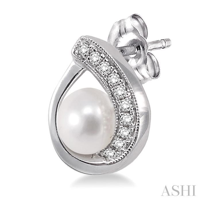 Treasure her smile with the vibrant shine of these milgrain finished Cultured Pearls and diamond earrings featuring a centrally staged Cultured Pearls enhanced with the excellent radiance of 20 alluring round cut diamonds in pear motif and beautifully prong set in 14 karat glinting white gold. Total diamond weight is 1/10 ctw and each Cultured Pearl measures 6×6 MM.