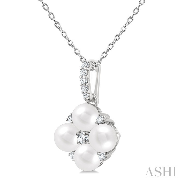 Treat yourself or someone to this stunning Cultured Pearl and diamond fashion pendant and make every moment a celebration of elegance and grace. Beautifully crafted, the pendant showcases a delicate floral design, created with Cultured Pearl and diamonds, adding a touch of romance to the piece. There is a prong set round cut diamond in the heart of the pendant, with 4 round 4 MM Cultured Pearl around it. Nestled between the Cultured Pearl is a prong set round cut diamond each, total 4. A loop chain holder, embellished with 5 prong set round cut diamonds, suspends the pendant on a CAT23 chain, ready to adorn your neckline. Both fashion pendant and chain are styled in a rhodium finish 10 karat white gold. Total diamond weight is 1/10 ctw.
