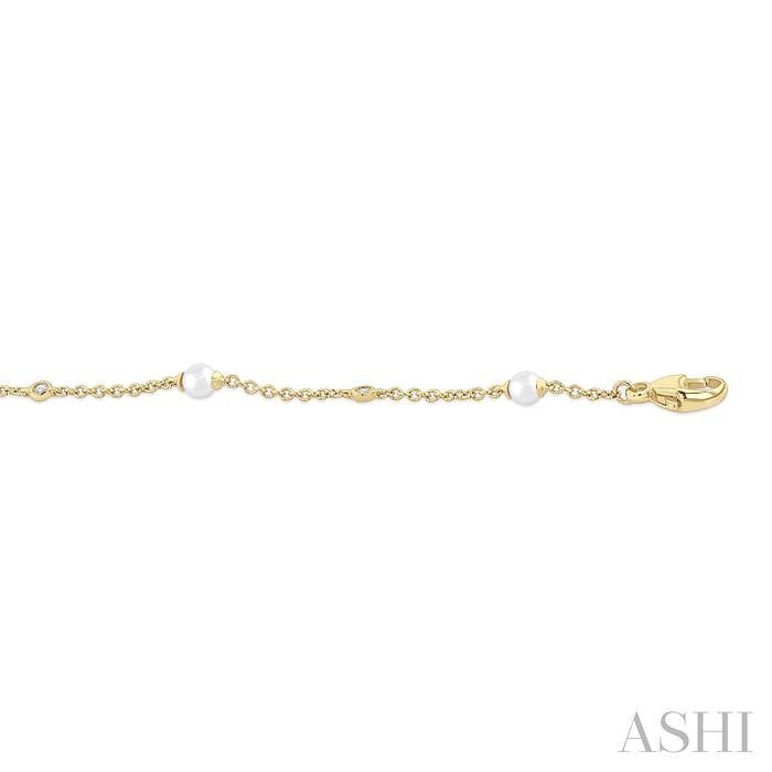 Enhance your look effortlessly, with this elegant and dainty Cultured Pearl and diamond fashion station bracelet, styled in a soothing and graceful 14 karat yellow gold. The bracelet features a 0.50″” CAT25 chain, on the stations of which, is placed 5 round 3 MM Cultured Pearls, alternating with 4 bezel set round cut diamonds. Securing the Cultured Pearl and diamond fashion station bracelet is an easy-to-wear lobster clasp. Smoothly transition from daily to formal looks, with this beautiful and reliable accessory, a must-have in your jewelry box. Total diamond weight is 1/20 ctw.