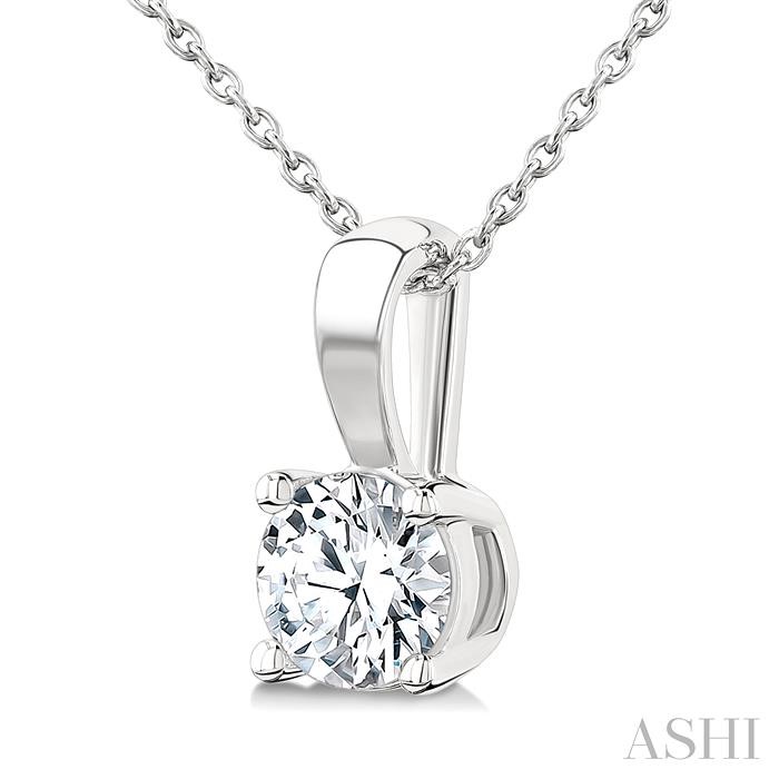 A breathtaking solitaire diamond pendant, this epitomizes grace and style, perfect for adding a touch of glamour to any look or occasion. The exquisite pendant features a dazzling 1 ctw round cut diamond solitaire, pristinely set on a circular mount, capturing the brilliance and allure of a single sparkling gem. Suspended delicately from a plain gold loop holder, the solitaire diamond pendant exudes understated sophistication and refinement. Included is a Cat 30 link chain complementing the pendant, both of which are styled in a rhodium finish 14 karat white gold. The total diamond weight is 3/4 ctw.