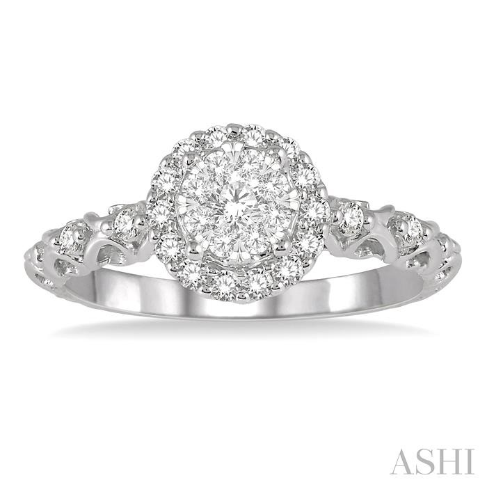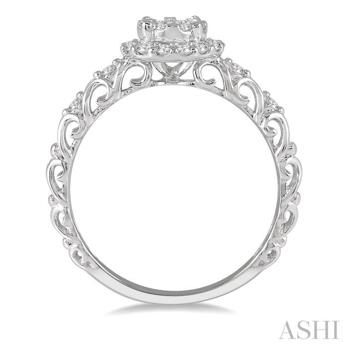 Celebrate a new beginning of your love life with this charming lovebright diamond engagement ring. Fashioned in glistening 14 karat white gold this ring features a set of 9 invisible set round cut diamonds at the center complemented by dazzling 18 pave and prong set round cut diamonds framing a halo and embellishes the intricate filigree-designed shank. Total diamond weight is 3/8 ctw.