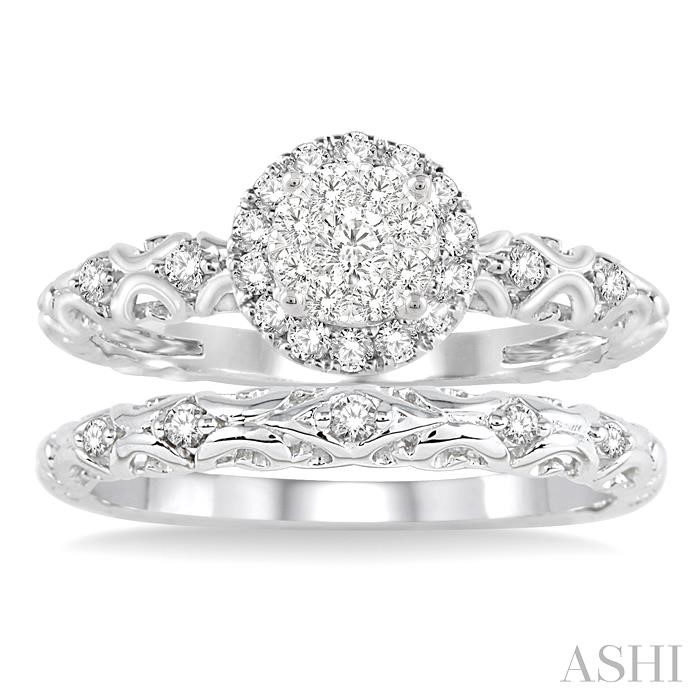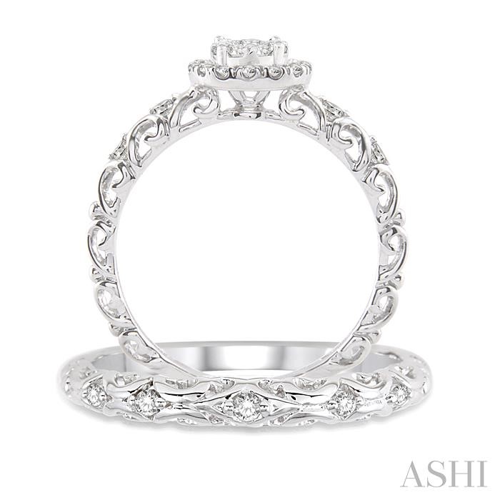 Sanctify your wedding vows with this perfect lovebright diamond wedding set. Fashioned in glistening 14 karat white gold the engagement ring features a set of 9 invisible set round cut diamonds at the center complemented by dazzling 18 pave and prong set round cut diamonds framing a halo and embellishes the intricate filigree-designed shank. The open work curved design wedding band is studded with 5 scintillating round cut diamonds, perfectly prong set. Total diamond weight for the set is 1/2 ctw.