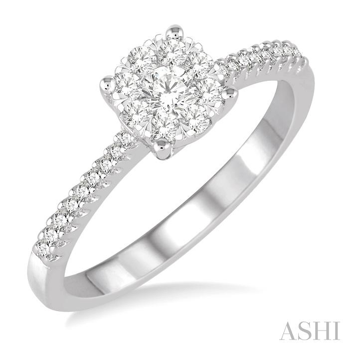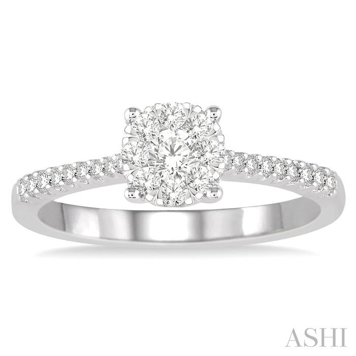 Allure your darling with the sparkle of this beautiful diamond Lovebright ring. Styled in 14 karat shining white gold this round shape ring showcases a set of 9 invisible set round cut diamonds at the center accented by 18 sparkling round cut prong set diamonds that flow down the shank in a brilliant row. Total diamond weight is 3/8 ctw.