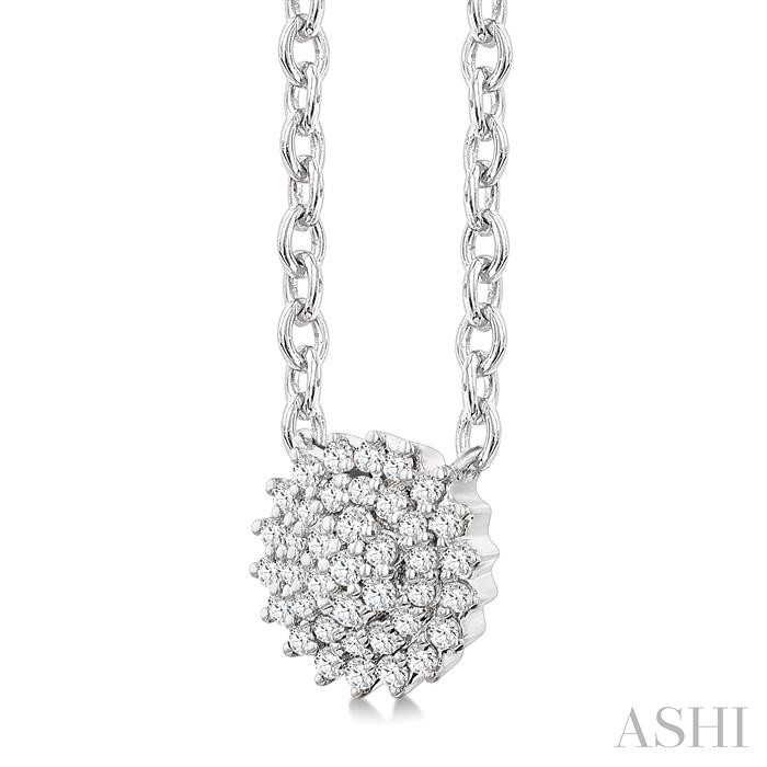 Simple but charming, this Petite diamond cluster fashion pendant makes a timeless addition to any jewelry collection. It features a delicate circular-shaped design adorned with a circular cluster of 39 prong set round cut diamonds. Each diamond is meticulously positioned to create a dazzling display of sparkle and brilliance. A CAT23 chain comes with the pendant, adding versatility to your styling options. Both Petite diamond cluster fashion pendant and chain are molded in a rhodium finish 10 karat white gold. Total diamond weight is 1/6 ctw.