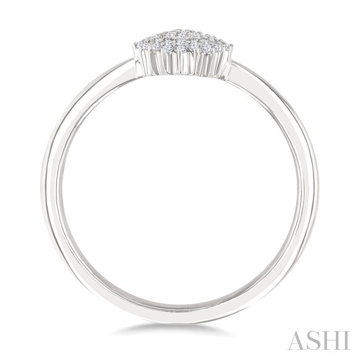 A stunning example of simplicity and elegance, this Petite diamond cluster fashion ring is designed to elevate any look with its sparkling beauty. Featuring at the heart of the ring is a round-shaped center mount adorned with a cluster of 39 prong set round cut diamonds. These create a mesmerizing display of brilliance, adding allure to the circular shape, further highlighted by a luminous plain gold shank. The Petite diamond cluster fashion ring is styled in a rhodium finish 10 karat white gold. Total diamond weight is 1/6 ctw.