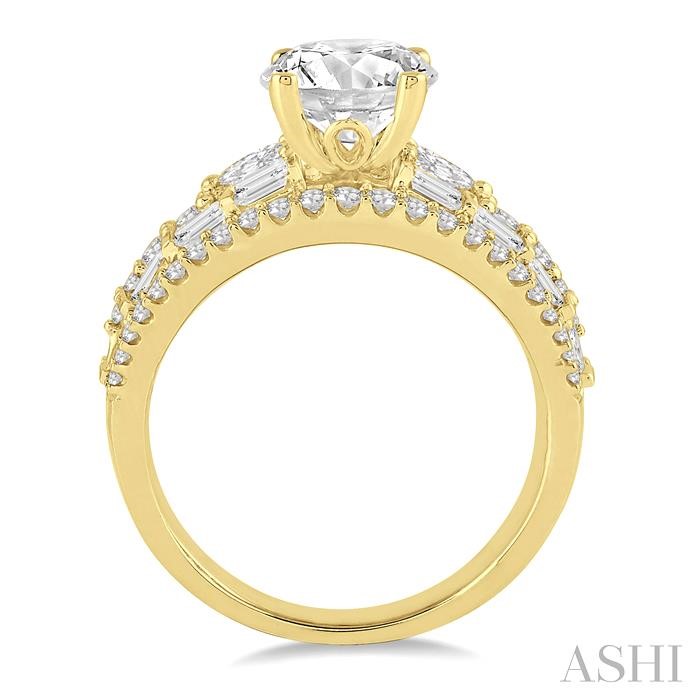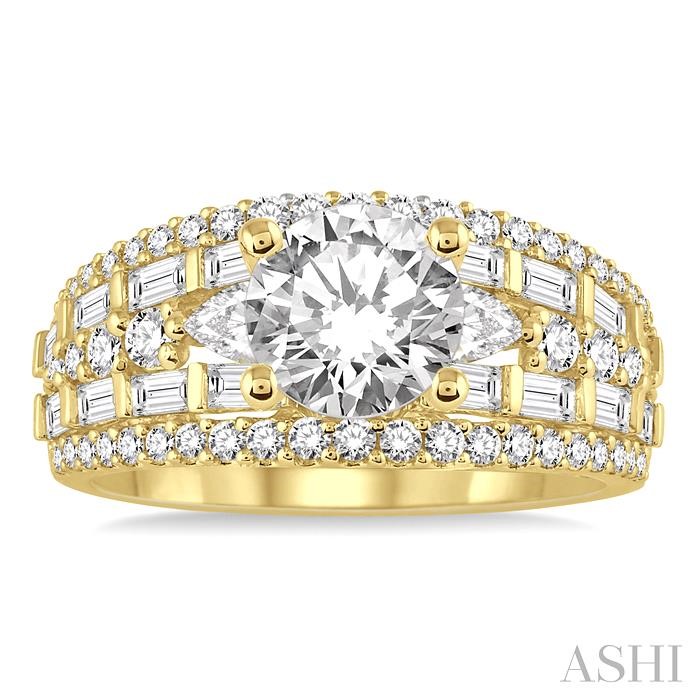 This alluring diamond semi-mount ring is a truly dazzling gift for your dazzling woman. Fashioned in luminous 14 karat yellow Gold the broad shank of this ring is embellished by two rows of 18 extravagant channel set pear and baguette cut diamonds that are alternated by galaxy and rows of shimmering 54 round cut diamonds with prong setting. Heighten center is designed to frame your choice of center stone ranging from 1.25 carat to 1.75 carat. Total diamond weight is 1 1/3 ctw.