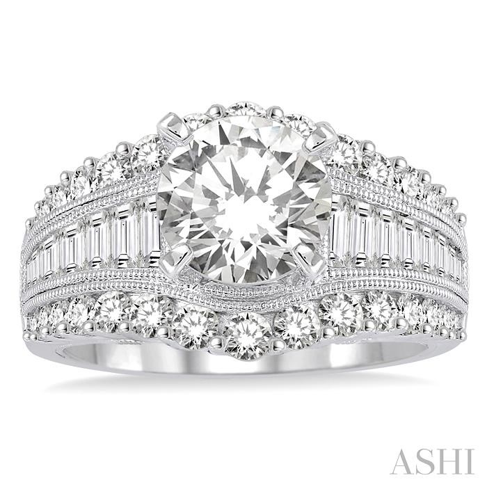 Present this milgrain finish diamond semi-mount ring as a symbol of your love with her. Styled in 14 karat lustrous white gold the shank of this ring is embellished by 46 brilliant channel and prong set baguette and round cut accented diamonds that flow down the broad shank in dazzling rows adding sparkle to the beauty of this opulent ring. The crown of this ring is designed to frame your choice of center stone ranging from 1.75 carat to 2.50 carat. Total diamond weight is 1 1/2 ctw.