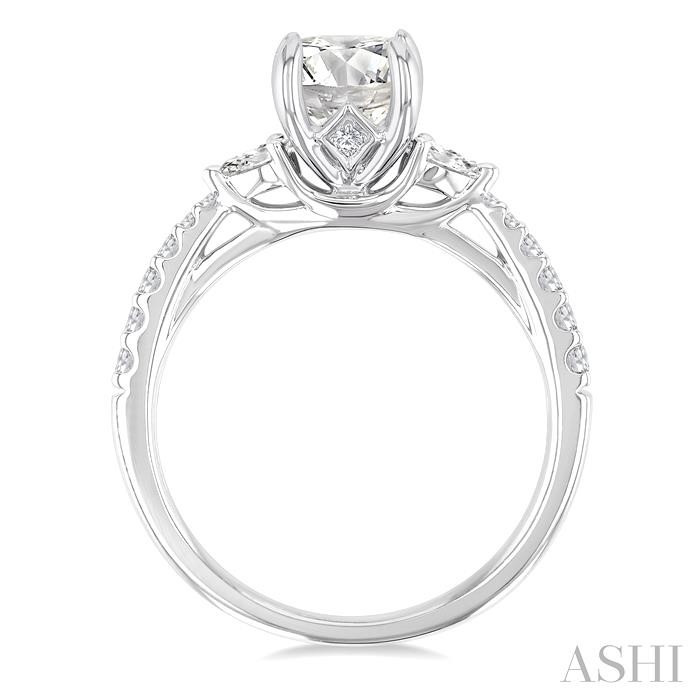 A semi-mount ring gives you the freedom to choose a center stone for it, which makes it pocket-friendly and fitted to your liking. This eye-catching diamond engagement ring is a beautiful option. It features a prong-raised tri-mount center, with a slightly higher raised 14 karat white gold center mount that houses a center stone of your choice. This must be a round cut stone, ranging from 0.85 ctw to 1.20 ctw. On the lower flanking mounts is embellished a prong set 1/10 ctw pear cut diamond each, total 2. Decorating the shank is 7 each, total 14, prong set round cut diamonds on either side. The semi-mount diamond engagement ring is styled in 14 karat white gold. Total diamond weight is 3/8 ctw.