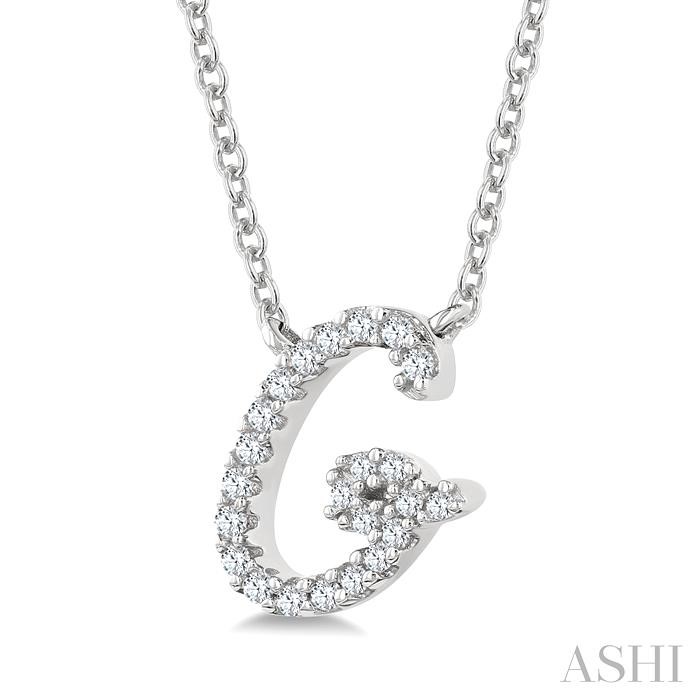 Add a personalized touch to your style, with this lovely initial ‘G’ diamond pendant. Include it to your everyday ensemble or give it as a meaningful gift to someone special, celebrating their unique identity with this attractive initial pendant. It features a beautifully stylized alphabet ‘G’ cutout, reflecting beauty and individuality. Round cut diamonds decorate the initial, giving it an eye-catching look. There is a total of 23 prong set round cut diamonds embellishing the pendant face. A CAT23 chain carries the diamond initial pendant, both of which are styled in a rhodium finish 10 karat white gold. Total diamond weight is 1/10 ctw.