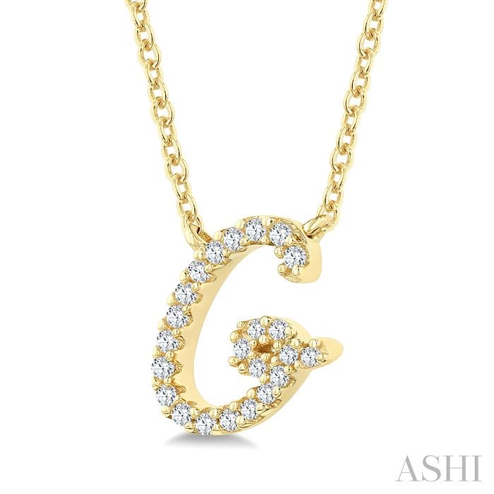 Add a personalized touch to your style, with this lovely initial ‘G’ diamond pendant. Include it to your everyday ensemble or give it as a meaningful gift to someone special, celebrating their unique identity with this attractive initial pendant. It features a beautifully stylized alphabet ‘G’ cutout, reflecting beauty and individuality. Round cut diamonds decorate the initial, giving it an eye-catching look. There is a total of 23 prong set round cut diamonds embellishing the pendant face. A CAT23 chain carries the diamond initial pendant, both of which are styled in 10 karat yellow gold. Total diamond weight is 1/10 ctw.
