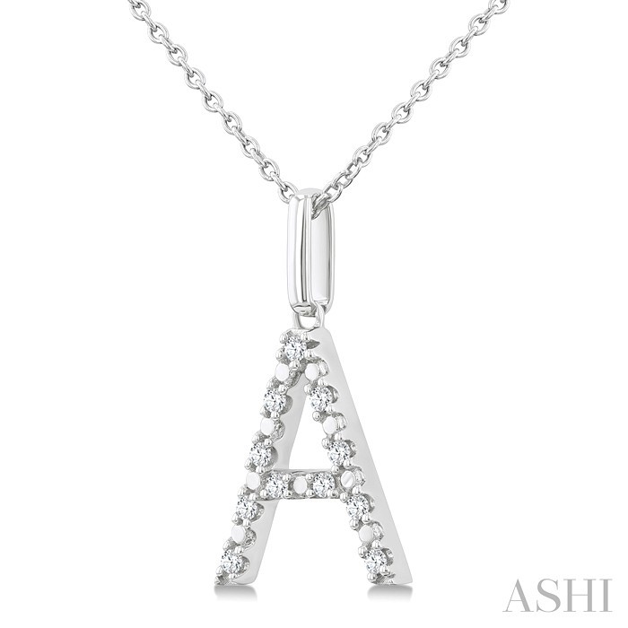 The initial ‘A’ holds significance for many, representing names, loved ones, or personal mantras. Whether worn as a symbol of self-expression or as a thoughtful gift for someone special, this diamond fashion pendant is a delightful expression of personal style, featuring the initial ‘A’ embellished with sparkling round cut diamonds. 11 prong set round cut diamonds delicately accentuate the letter, adding a touch of beauty to the pendant. Paired with a sleek 1.00 MM SSL cable chain, both of which are styled in a rhodium finish sterling silver, this pendant is perfect for everyday wear. Total diamond weight is 1/10 ctw.