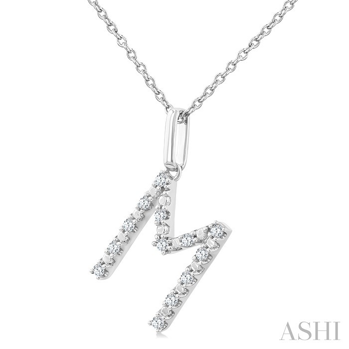 The initial ‘M’ holds significance for many, representing names, loved ones, or personal mantras. Whether worn as a symbol of self-expression or as a thoughtful gift for someone special, this diamond fashion pendant is a delightful expression of personal style, featuring the initial ‘M’ embellished with sparkling round cut diamonds. 13 prong set round cut diamonds delicately accentuate the letter, adding a touch of beauty to the pendant. Paired with a sleek 1.00 MM SSL cable chain, both of which are styled in a rhodium finish sterling silver, this pendant is perfect for everyday wear. Total diamond weight is 1/10 ctw.