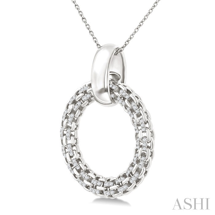 This bold and elegant diamond pendant is designed to impress, featuring a unique five-row chunky cable chain pattern in a captivating circular shape, symbolizing unity, eternity and perfection. Adorned with 32 prong set round cut diamonds, the pendant sparkles with sophistication. A sleek plain silver bar loop at the top connects the pendant to a delicate 1.00MM SSL cable chain, both of which are styled in a rhodium finished sterling silver. Total diamond weight is 1/8 ctw.