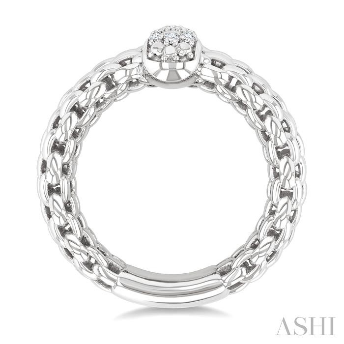 Whether you’re dressing up for a night out or simply want to add some sparkle to your day, this bold silver cable chain inspired diamond fashion ring is the perfect choice to impress and inspire. The striking piece blends boldness with elegance, making it a standout accessory for any ensemble. It features a bold silver cable chain look shank that exudes rugged sophistication, while its eye-catching dome-shaped centerpiece dazzles with three Chevron rows of pave set round cut diamonds. The diamond fashion ring is molded in a rhodium finished sterling silver. Total diamond weight of 1/8 ctw.