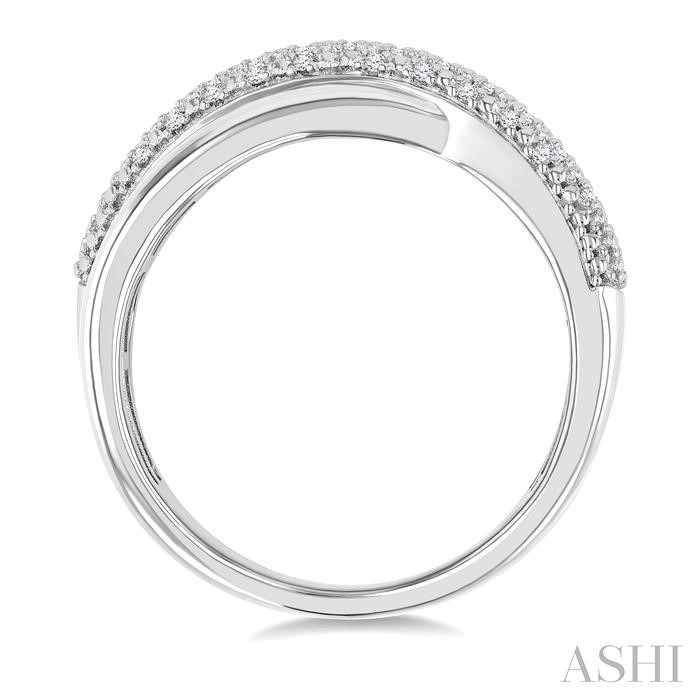 A stylish bold diamond fashion band, this is a good addition to one’s accessory collection. It features a unique triple-sectioned criss-cross pattern, where a plain silver arm and a diamond-encrusted arm criss-cross to create a captivating design. The center section, also in plain silver, merges seamlessly with the underpassing plain silver exterior arm to form a bold, wider look, while the sleek diamond arm crosses over to add a touch of sparkle. A total of 37 prong set round cut diamonds adorn the diamond arm, enhancing the band with a subtle brilliance. The fashion band is styled in a rhodium finish sterling silver. Total diamond weight is 1/8 ctw.