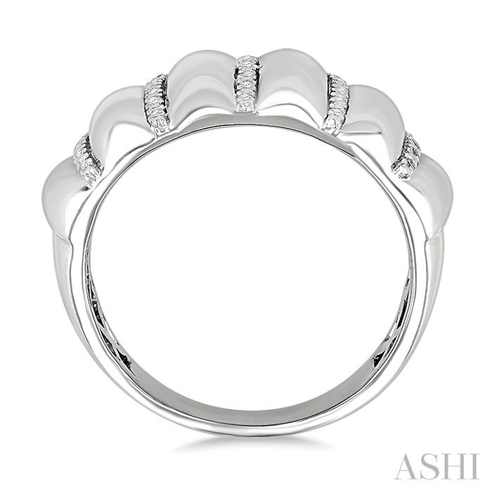 Maintain your impeccable style choices, with this chic diamond wide fashion band, which adds panache to your ensembles. The bold fashion ring features a striking dome-shaped design with a ribbed pattern that immediately catches the eye. Grooves within this ribbed pattern are meticulously adorned with round cut diamonds, adding a touch of sparkle to its bold form. At the heart of the band, 8 pave set round cut diamonds fill the central groove, creating a stunning focal point. The flanking grooves are embellished with 6 pave set round cut diamonds, followed by 5 pave set round cut diamonds in the subsequent grooves, total 30 diamonds in all. The fashion band is styled in rhodium finish sterling silver. The total diamond weight is 1/10 ctw.